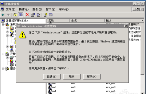 第四步,在右侧 选中Administrator 右键单击,选中 设置密码,会弹出询问是否设置密码。